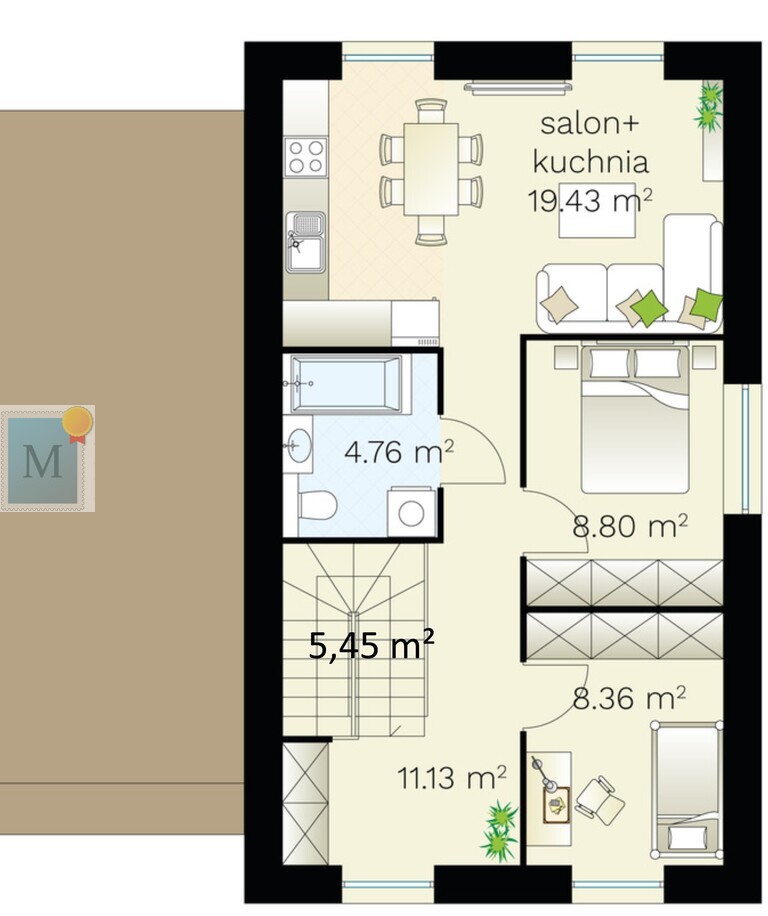 Na mieszkanie składają się pokój dzienny z aneksem kuchennym o pow. 19,43m2, pokój o pow. 8,80m2, sypialnia o pow. 8,36m2,