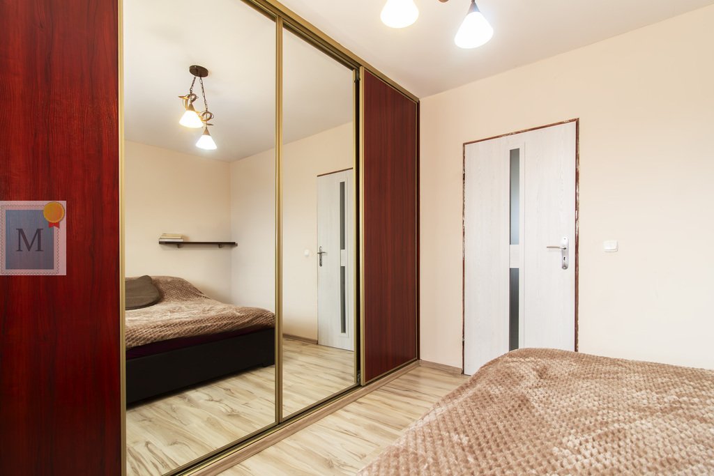 Sypialnia z dużą szafą w zabudowie na całą ścianę z dużymi lustrami.