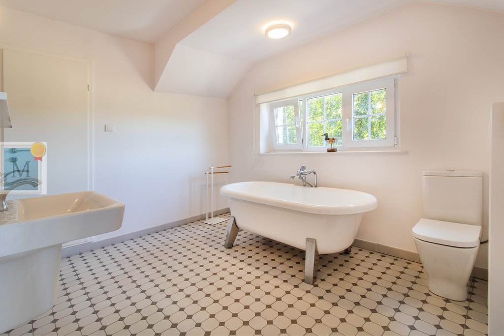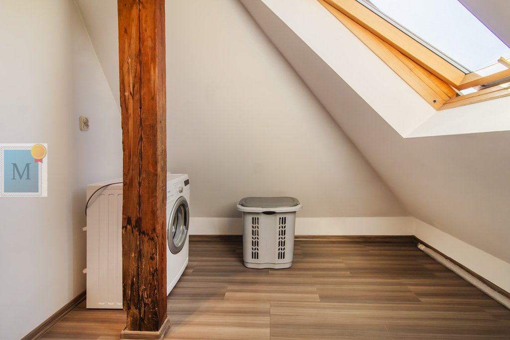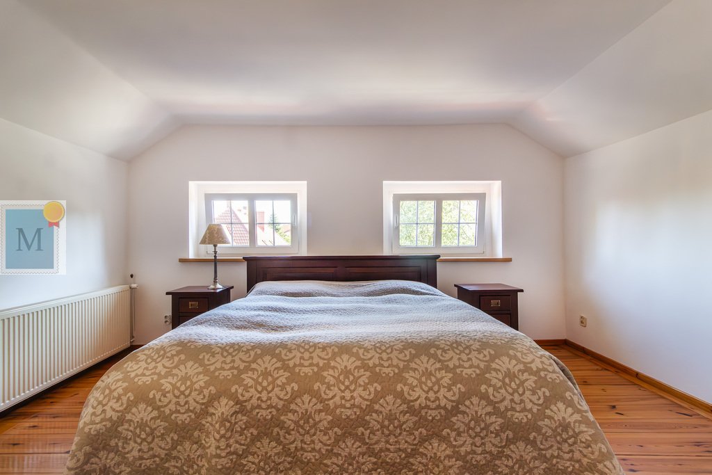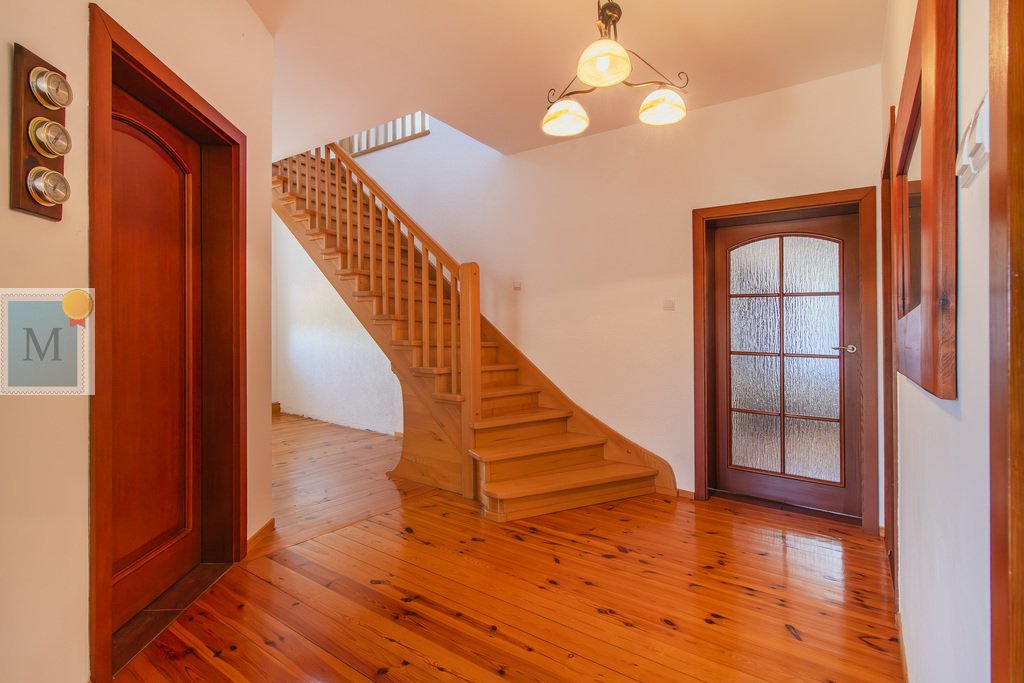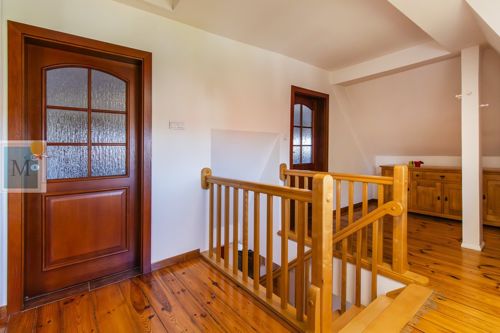 Na górze przestronna klatka schodowa, dwie sypialnie, łazienka z wanną, garderoba i pralnia.