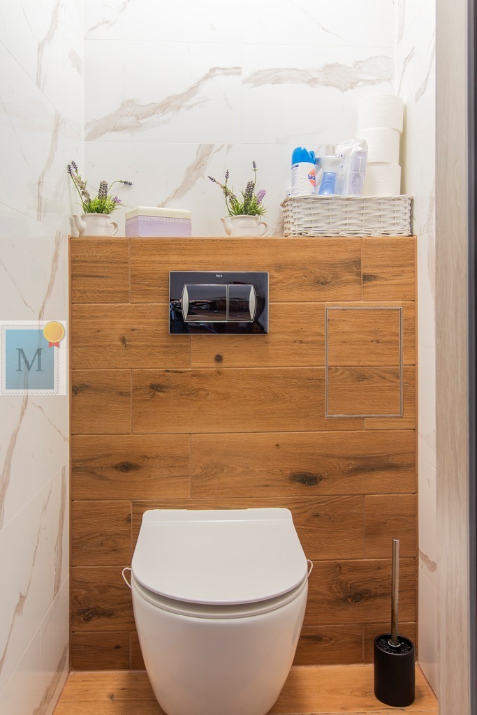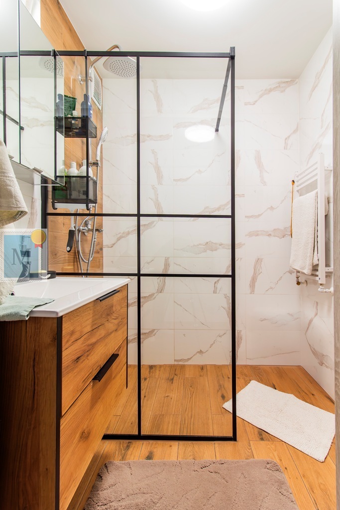 Łazienka ok. 4m2 z nowoczesnym prysznicem i odpływem liniowym, osobne Wc.