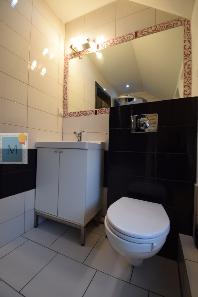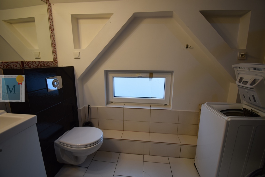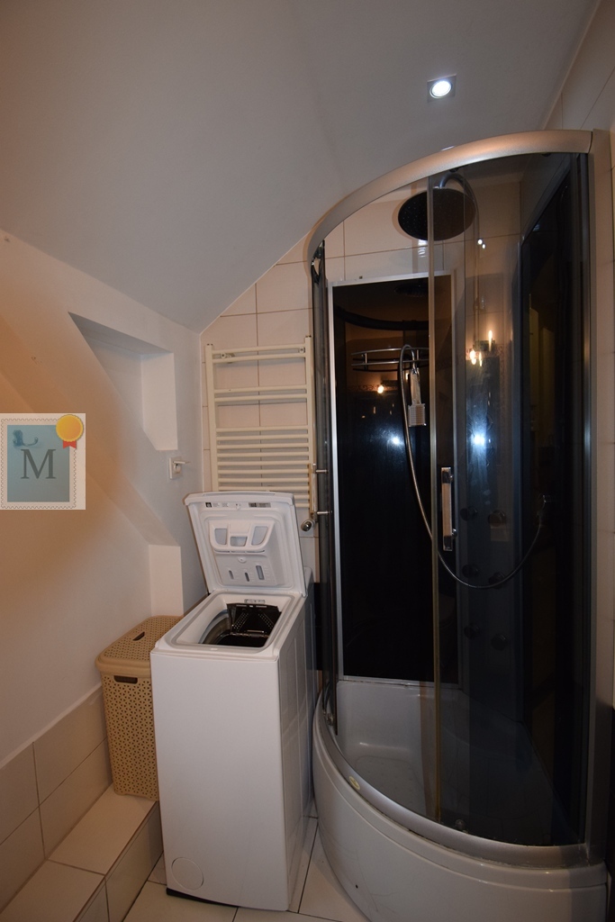 Łazienka z oknem, wc, kabina prysznicowa, nowa pralka, grzejnik drabinkowy.