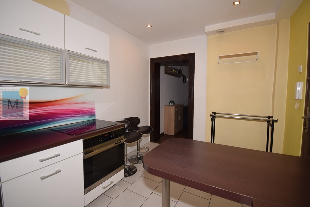 Kuchnia umeblowana, płyta grzewcza elektryczna, piekarnik, zlew, lodówka.